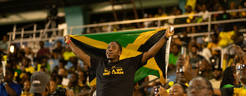 Waving his black., green and gold flag up high, popular influencer Darrow G shows his love for football during the Jamaica vs Bermuda World Cup qualifiers match sponsored by Wray & Nephew White Overproof Rum. (Photo: Contributed)