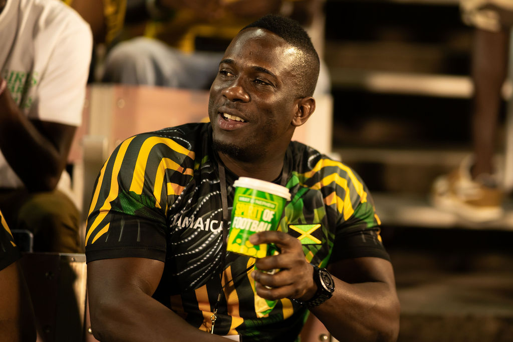 Chiney K gets playful with cameras while enjoying the halftime entertainment at the Wray and Nephew White Overproof Rum-sponsored Reggae Boyz World Cup qualifiers match on Tuesday, October 14, 2025 at the National Stadium. (Photo: Contributed)